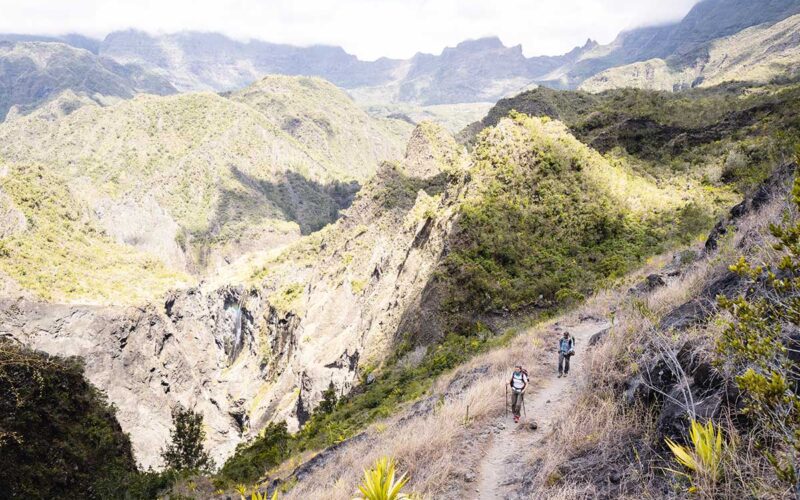 Die vulkanische Struktur der Landschaft sorgt dafür, dass »zu Fuß«, abgesehen von Hubschraubern, das einzige Fortbewegungsmittel im Mafate ist. Alle Zugänge in den Talkessel liegen oben am Berg. Wo Teerstraßen enden, beginnen bestens präparierte Wanderpfade, darunter der Fernwanderweg GR R3. Auf rund 100 Kilometern führen sie weder technisch noch ausgesetzt durch das Gebiet, fordern mit ihren zahlreichen Stufen aber Kondition.