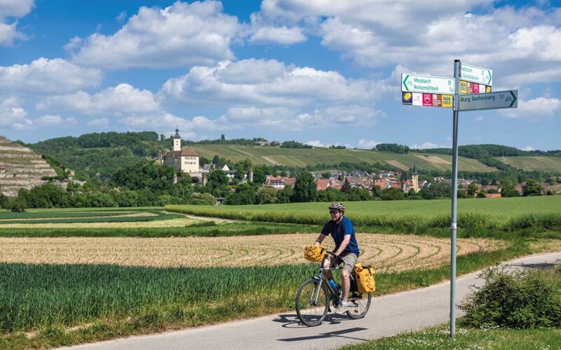 Die 860 Kilometer lange Radroute quer durch Deutschland, von Mannheim nach Bayreuth, quillt über vor mittelalterlichem Prunk, protzt mit Barock. Eingebettet in die lieblichen Flusslandschaften von Neckar, Kocher und Tauber schlängelt sich der Radweg durch Flussauen und Moore, zwischen Weinbergen und den bizarren Felsgipfeln der Fränkischen Schweiz hindurch – stets die nächste Burg im Visier.