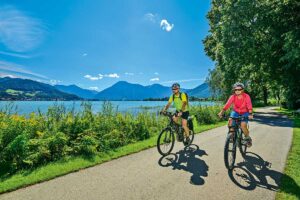 Mit dem E-Bike kann man die drei schönsten oberbayerischen Seen genussvoll umrunden. Wir rollen um Tegernsee, Starnberger See und Chiemsee – Badeplätze, autofreie Wege, lauschige