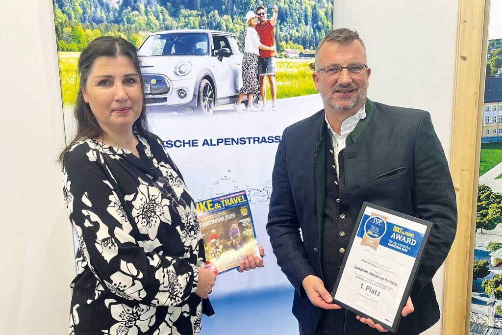 Ausgezeichnete Strecke: Der Bodensee-Königssee-Radweg sichert sich Platz 1 in der Kategorie »Die beliebtesten Alpentouren«. Franz Reil, Geschäftsführer von Alpin Consult, nahm die Urkunde freudig von Marion Nunn (MSV Medien Baden-Baden) entgegen.