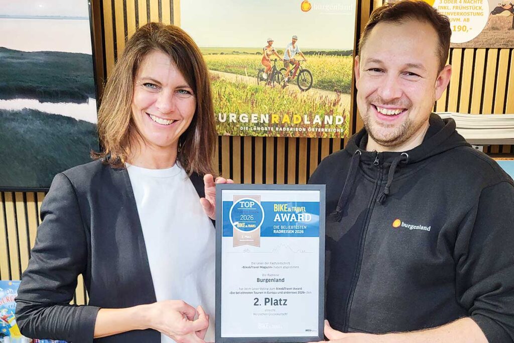 Strahlender Gewinner: Andreas Sagmeister, Team Marketing Services bei der Burgenland Tourismus GmbH, erhielt von Tanja Willmann (MSV Medien Baden-Baden) die Auszeichnung für Platz 2 in der Kategorie »Die beliebtesten Regionen in Europa« für das Burgenland.