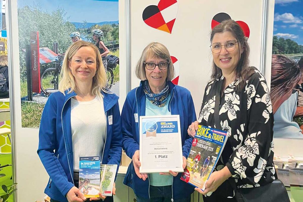 Platz 1 für den Donauradweg: Sabine Malecha (Mitte), Geschäftsführung Deutsche Donau Tourismus e. V., und Vanessa Kast-Adamek (links) freuen sich über den Sieg in der Kategorie »Die beliebtesten Touren in Deutschland«. Die Ehrung nahm Marion Nunn (rechts, MSV Medien Baden-Baden) vor.