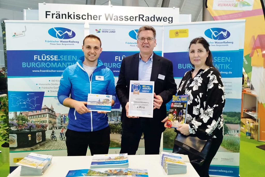 Wieder auf dem Siegerpodest: Benedikt Kamm (AG Fränkischer WasserRadweg, links) und Hans-Dieter Niederprümm, Geschäftsführer des Tourismusverbands Fränkisches Seenland (Mitte), feiern Platz 2 für den Fränkischen WasserRadweg. Die Auszeichnung überreichte Marion Nunn (MSV Medien Baden-Baden).