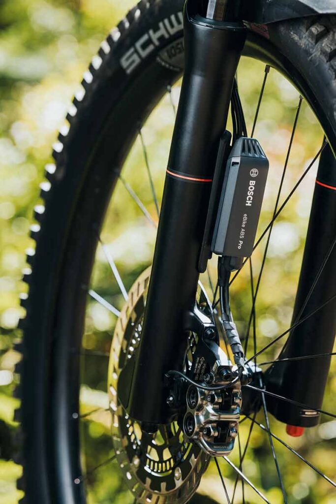 Der Weg fällt steil ab, Schotter wechselt zu feuchtem Wurzelteppich, die Bremsen arbeiten permanent. Instinktiv greifen wir zur Vorderradbremse – und genau hier zeigt jetzt auch das Bosch eBike ABS Pro, was es kann. Droht das Vorderrad zu blockieren, regelt das System den Bremsdruck innerhalb von Millisekunden. Wo wir normalerweise zaghaft anbremsen und den Trail eher vorsichtig abtasten würden, können wir jetzt später und entschlossener zupacken. Das Ergebnis spüren wir nach wenigen Kurven: Wir konzentrieren uns noch besser auf die Linie, haben noch mehr Vertrauen in unser Fahrkönnen und können bewusst an unsere Limits gehen.