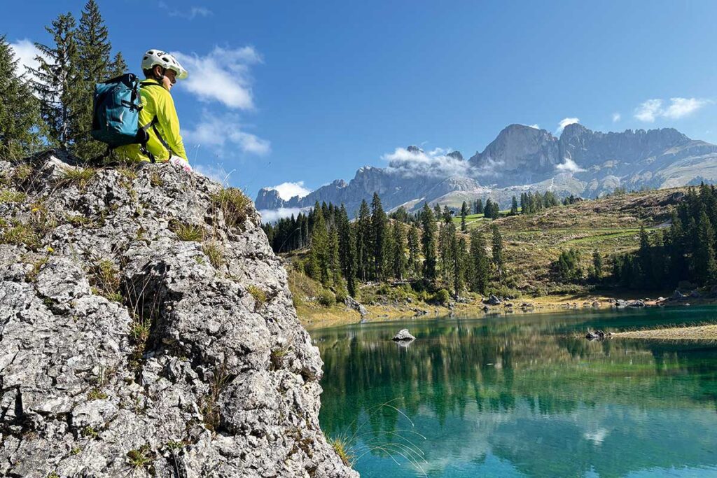 Super Timing: Gerade als wir unsere Bikes aus dem Radkeller des Hotels schieben, taucht die Sonne hinter den Gipfeln der Latemargruppe hervor. Es ist wolkenlos, leicht kühl, und jeder Atemzug ist eine Wohltat für die Seele. Ein Herbsttag wie im Bilderbuch. Wir wollen hinauf zum Karersee, der auch als »Märchensee der Dolomiten« bezeichnet wird.