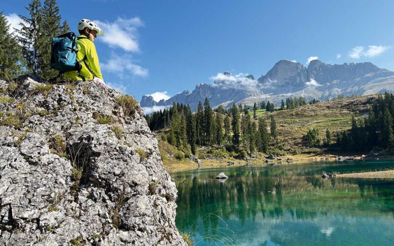 Super Timing: Gerade als wir unsere Bikes aus dem Radkeller des Hotels schieben, taucht die Sonne hinter den Gipfeln der Latemargruppe hervor. Es ist wolkenlos, leicht kühl, und jeder Atemzug ist eine Wohltat für die Seele. Ein Herbsttag wie im Bilderbuch. Wir wollen hinauf zum Karersee, der auch als »Märchensee der Dolomiten« bezeichnet wird.