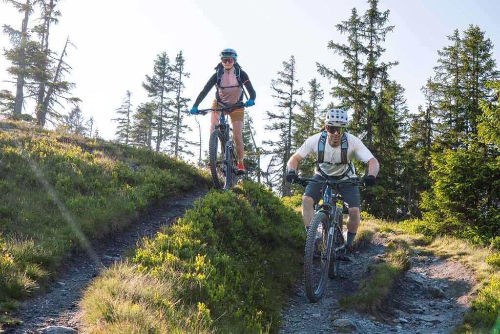 Am längsten Tag des Jahres ist mangelnde Zeit für eine Mountainbiketour selten das Problem, Schlaf dagegen schon. Wer den Sonnenaufgang sehen will, muss jetzt im Hochsommer unmoralisch früh raus. Für unseren ersten Tag in Flachau im Salzburger Land einigen wir uns deshalb auf eine Morgen- statt auf eine Sonnenaufgangstour und starten um 6 Uhr. »Immerhin eineinhalb Stunden später als der Gockelhahn«, versuche ich den spanischen Langschläfer Jesús zu motivieren, als wir von unserem Zimmer im Bike-Hotel Dips & Drops hinuntergehen in den angeschlossenen Fahrradladen.