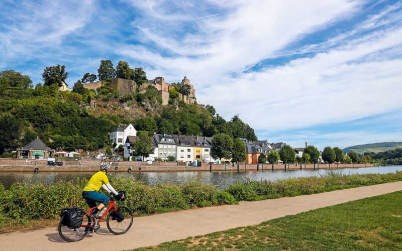 Schiebend bewege ich mich den steilen Laurentiusberg inmitten der Altstadt von Saarburg hinauf. Gleich schließt der Campingplatz. Ich möchte mich beeilen, doch die Pedalplatten meiner Schuhe rutschen auf dem Kopfsteinpflaster. So behalte ich den Schwung und setze aufmerksam einen Fuß vor den anderen. In der Oberstadt spurte ich durch die Gassen, dann über einen geschotterten Waldweg bis zum Platz. Die Tür der Rezeption ist geschlossen: Erstmal durchatmen und einen Schluck aus der Radflasche nehmen. Es gehen mir schon Plan B und Plan C durch den Kopf, als ich ein freundliches »Herzlich willkommen!« höre.
