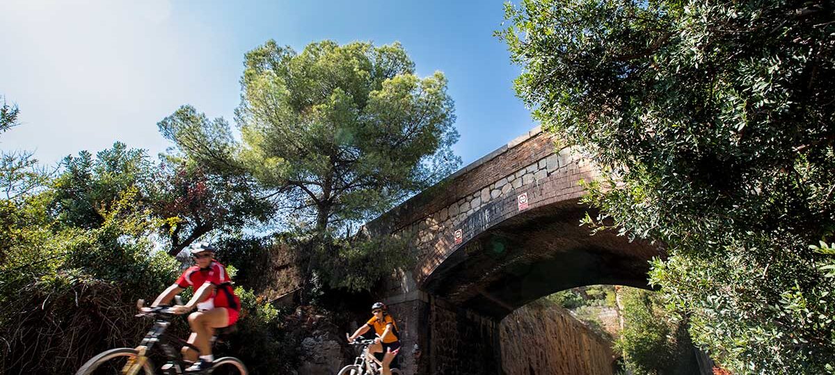 Asphaltierter Radweg auf ehemaliger Bahntrasse, der die Strände von Benicàssim und Oropesa del Mar verbindet. Ein Tunnel und in den Fels der Sierra de Oropesa gesprengte Scharten machen die Tour abwechslungsreich. Empfehlenswert ist ein Stopp für den Aufstieg zu den Wachtürmen Torre de la Corda und Torre de la Colomera. Die Tour endet an der Festung Torre del Rey mit dem gegenüberliegenden Leuchtturm. Die Tour lässt sich zu einer etwa 60 km langen Rundtour ausweiten: Von Oropesa den Paseo Marítimo de la Concha an der Siedlung Marina d’Or vorbei, die Avenida Colada del Pou und hinauf auf den Puerto de la Bandereta, wieder hinab nach Cabanes. Weiter durch Montalba, dann über die CV-15 und die CV-10 und durch den Naturpark Desert de les Palmes zurück nach Oropesa.