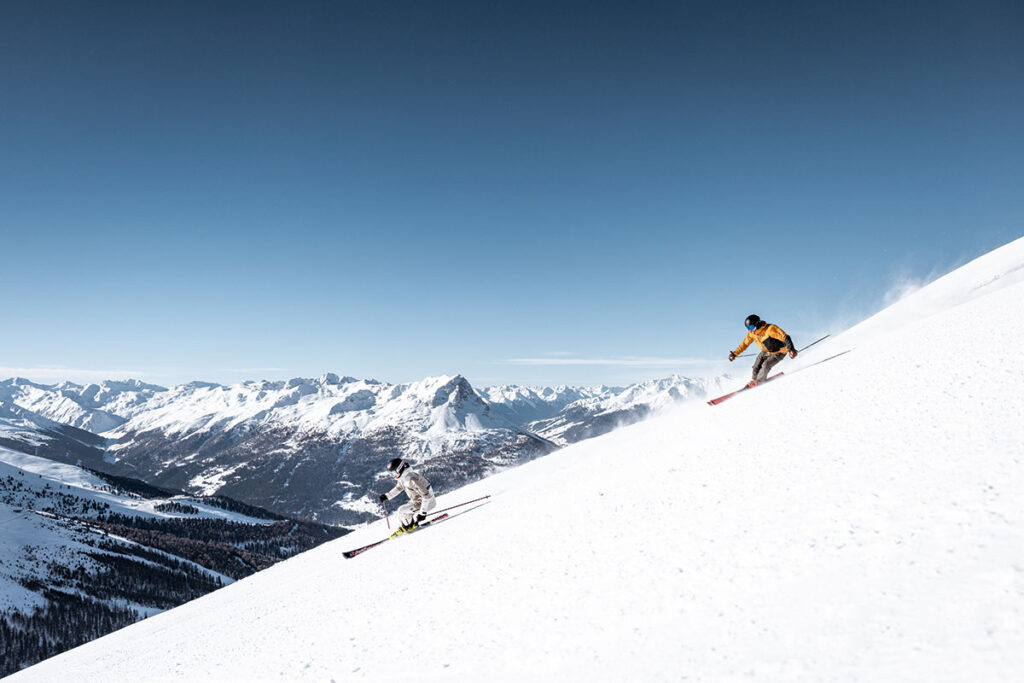 Am nächsten Morgen fahren wir mit der Bergbahn hinauf zum Gueser Kopf auf 2.750 Meter. Es ist noch früh, die Sonne steht tief, der Schnee glitzert wie feines Glas. Die Aussicht reicht über drei Länder, die Gipfel zeichnen sich scharf gegen den Himmel ab. Die Abfahrt hinunter ist legendär: neun Kilometer, 1.350 Höhenmeter. Sie beginnt steil auf einer schwarzen Piste, wechselt dann auf rote und blaue Abschnitte. Eine Tour durch verschiedene Welten – oben anspruchsvoll, unten genussvoll.