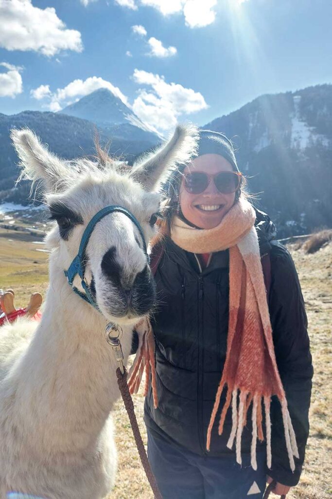 Nach circa einer Stunde erreichen wir eine kleine Lichtung. Jemand gießt Tee aus einer Thermoskanne, der Duft von Bergkräutern steigt in die Nase. Ramoz legt sich in den Schnee, kaut an einem Büschel Gras. Ich stehe daneben, kraule vorsichtig seinen Hals – und spüre ein friedliches Gefühl. Kein großes Abenteuer, kein Gipfelerlebnis. Aber ein Moment, der bleibt. Als wir zurück am Hof sind, halte ich kurz inne, schaue ihm nach – und denke, dass es kaum eine bessere Art gibt, in den Bergen zur Ruhe zu kommen als im Tempo eines Lamas.