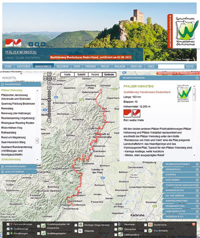 Sowohl in der Rubrik »Wanderwege« als auch unter »Regionen« lassen sich diverse Infos je nach Geschmack des Nutzers ausfiltern. Bei allen Wegen gibt es nicht nur den entsprechenden Kartenausschnitt, sondern dazu noch viele praktische weitere Infos etwa zur Wegebeschaffenheit, Etappen-Downloads fürs GPS-Gerät, Wanderkarten, Übernachtungsmöglichkeiten oder Ansprechpartner. Selbst Höhenprofile lassen sich etappengenau einblenden, ebenso wie nützliche Zusatzinfos zu Touristinfos, Fotos und Wikipedia-Einträge. Ganz neue Möglichkeiten bieten die Lieblingsplätze und Wegbewertungen, die dem Nutzer die Möglichkeit geben, seine Wandererfahrungen mit anderen Wanderern zu teilen. Die Interaktion mit anderen ist auch durch die Einbindung sozialer Netzwerke auf der Homepage möglich.