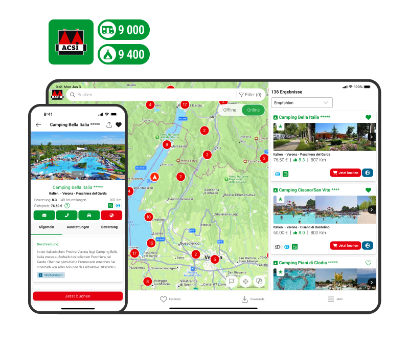 Schnell und einfach einen geeigneten Campingplatz oder Wohnmobilstellplatz in Europa finden – das geht ganz unkompliziert mit der ACSI Camping Europa-App! Mit dieser App erhalten Sie Zugang zu 9400 von ACSI geprüften Campingplätzen und 9000 kontrollierten Wohnmobilstellplätzen. Finden Sie auch ohne Internetverbindung unterwegs den perfekten Campingplatz, der zu Ihren Wünschen passt – mit hilfreichen Bewertungen und der Möglichkeit, schnell und unkompliziert zu buchen.