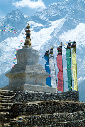 Der Traum, die höchsten Berge der Welt mit eigenen Augen zu sehen, treibt jährlich tausende auf die Trails, die meist uralten Karawanenwegen folgen. Die frommen Bergbewohner der Alpen haben Kruzifixe und Kapellen aufgestellt. Im Himalaya ist es nicht anders. Nur dass hier Tschorten, Gebetsmühlen und -fahnen der Buddhisten und Opferplätze der Hindu den Weg säumen. Wer hier wandert, taucht in die mystische Welt zweier Religionen voller Geheimnisse und Rätsel ein. Nirgendwo offenbart sich tiefe Gläubigkeit so deutlich wie in den Hochregionen des Himalaya. Über allem thront »Chomolungma, die Göttinmutter der Erde«. So nennen die Tibeter den höchsten Berg der Welt. Die Nepali nennen ihn »Sagarmatha, die Stirn des Himmels«.