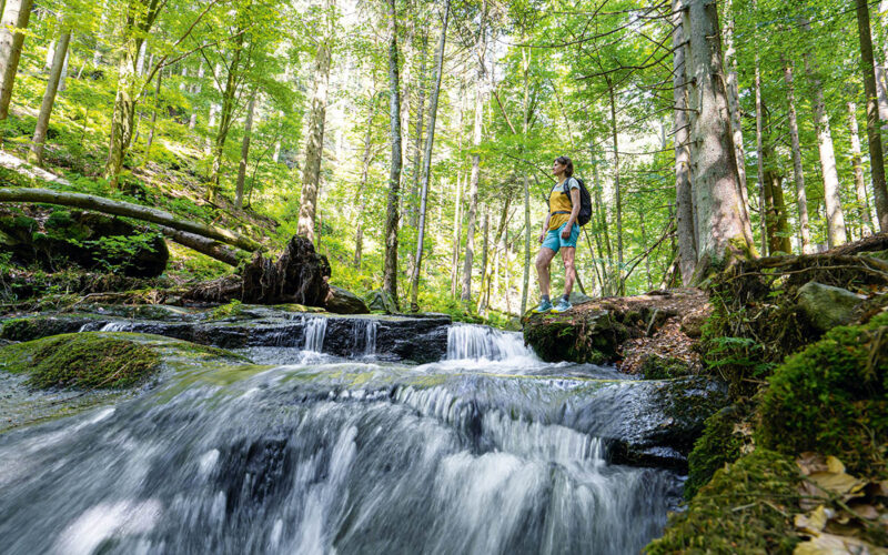 Während ich in der Nähe von Sankt Englmar im Bayerischen Wald wandere, kommt mir Peter Handkes Gedicht »Über die Dörfer« in den Sinn. Bäume und nichts als Bäume um mich herum. Es rauscht, es plätschert und es fühlt sich ein bisschen an wie beim Waldbaden-Kurs vor ein paar Monaten. Nur, dass ich damals in Zeitlupentempo unterwegs war und heute zügigen Schrittes. Aber Waldbaden folgt sowieso keinem konkreten Plan. Im Grunde geht es darum, seine Sinne zu öffnen. Für den Gesang der Vögel, den Duft von Harz, das Plätschern des Bächleins oder den zarten Wind auf der Haut.